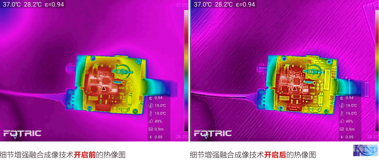 FOTRIC还拥有细节增强融合成像技术,可以在热像图上融合可见光轮廓细节,轻松定位故障的具体位置。