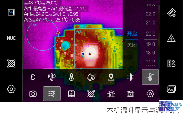 本机通过设置基准温度实现全画面所有测温点温度显示为实际温度减去基准温度后的温升温度,方便温升筛查;可通过温差功能来计算任意测温标识的温差或任意测温标识与参考温度的温差。