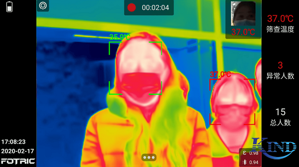 本机自带的筛查模式,可以自动识别镜头前2m内出现的人员面部,自动测量面部温度,筛查出高温人员。出现高温人员后系统发出声响、出现高温的人脸识别框变红,并且系统可自动拍摄照片并截取头像展示出来,便于找到超温人员,该筛查模式还可以自动统计检测人员数量与报警人员数量。