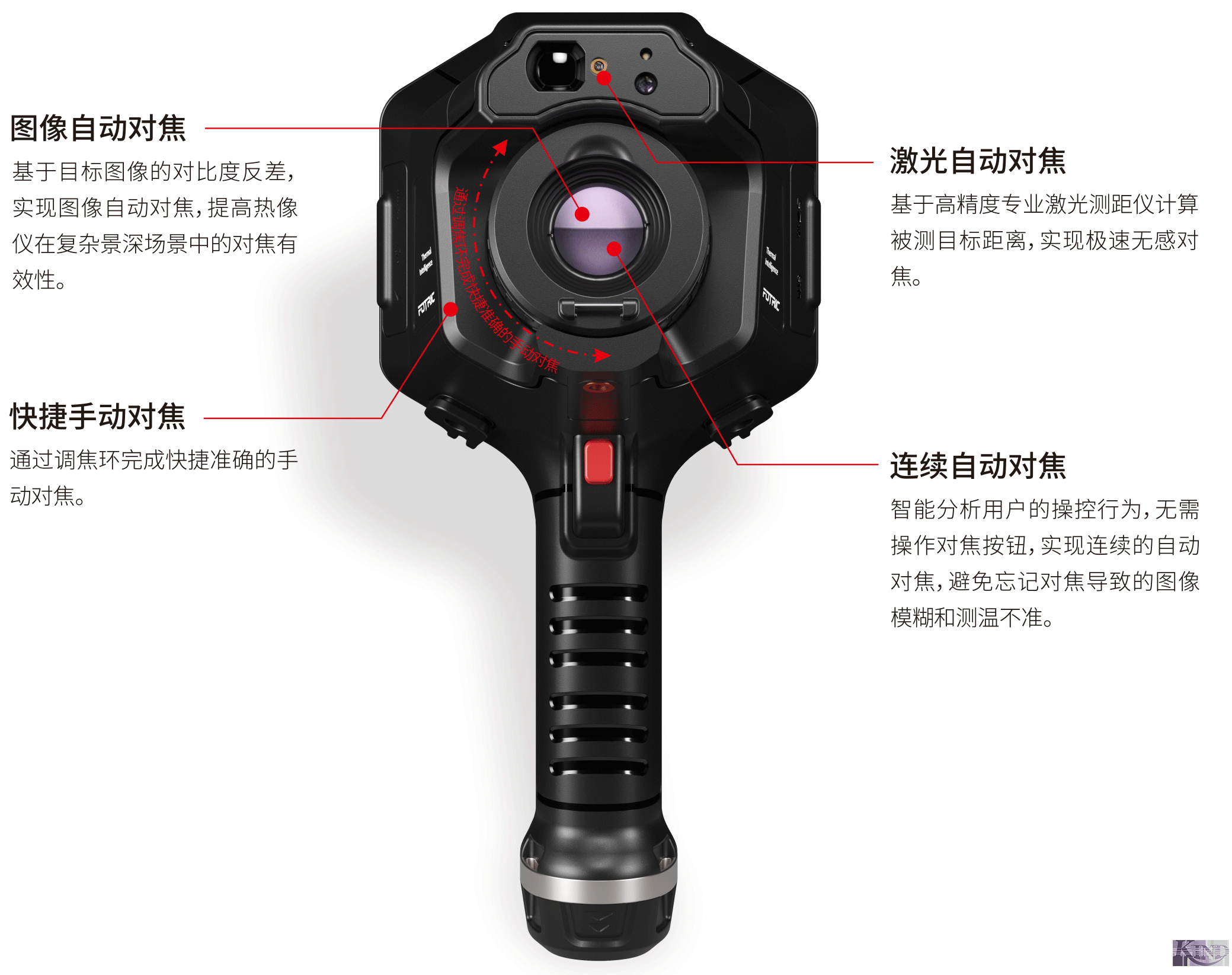 FOTRIC全新打造的TurboFocus智能对焦系统,充分融合图像自动对焦和激光自动对焦的优点,并以智能连续对焦的方式,保证成像清晰,避免对焦不准造成的测温误差。